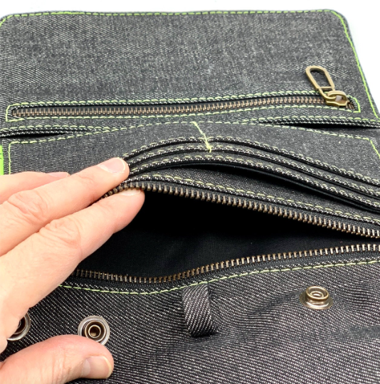 >Tiene dos compartimentos con cremallera y un tarjetero.